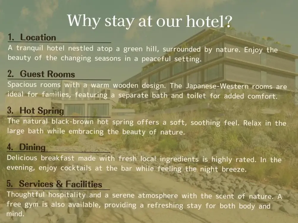 Es ist verrückt, für ein Hotel dieses Standards so wenig zu bezahlen. Wir fuhren von Kyoto nach Tokio und wollten die Reise unterbrechen. In der Nähe der Autobahn gelegen, mit hervorragenden Annehmlichkeiten und echtem 5-Sterne-Design. Unglaubliches Personal hat die Menüs für uns auf ein Blatt Papier in italienischer Sprache übersetzt, fantastisch.